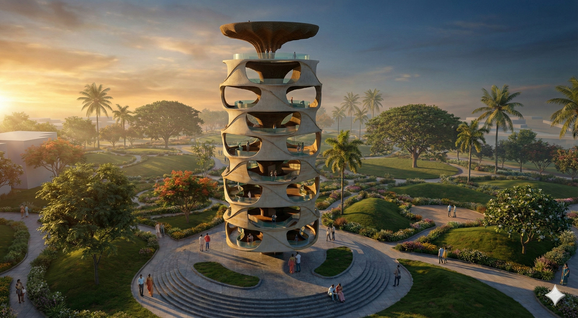 Situated within the verdant expanse of Coimbatore’s Semmozhi Poonga, this architectural intervention proposes a radical departure from the traditional low-lying footprint of the planned central amphitheater, replacing it with a monumental 50-meter observation tower that serves as a vertical “living spine” for the urban forest.